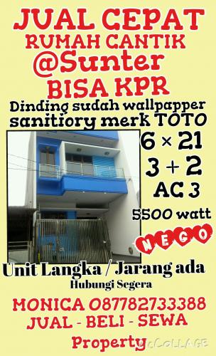 - Info Tambahan: Jual cepat rumah @Sunter lokasi strategis, 1.5 meter lebih tinggi dari jalan, dinding wallpapper, AC 3, unit sanitiary Toto, gudang hanya1 unit