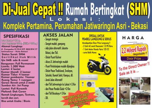 Dijual Cepat Rumah Bertingkat SHM Siap Huni di Kompleks Pertamina Jatiwaringin Bekasi